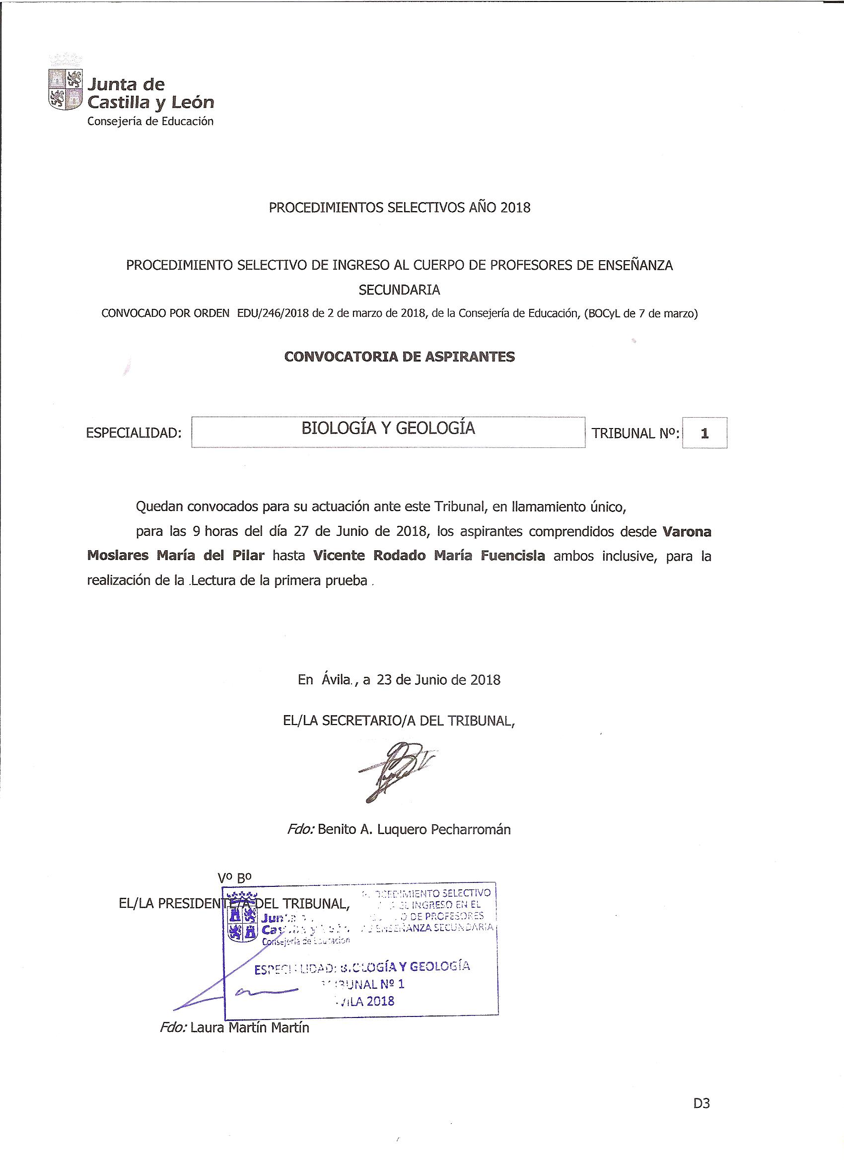 Llamamiento para realizar la lectura de la primera pueba para el día 28 de junio de 2018