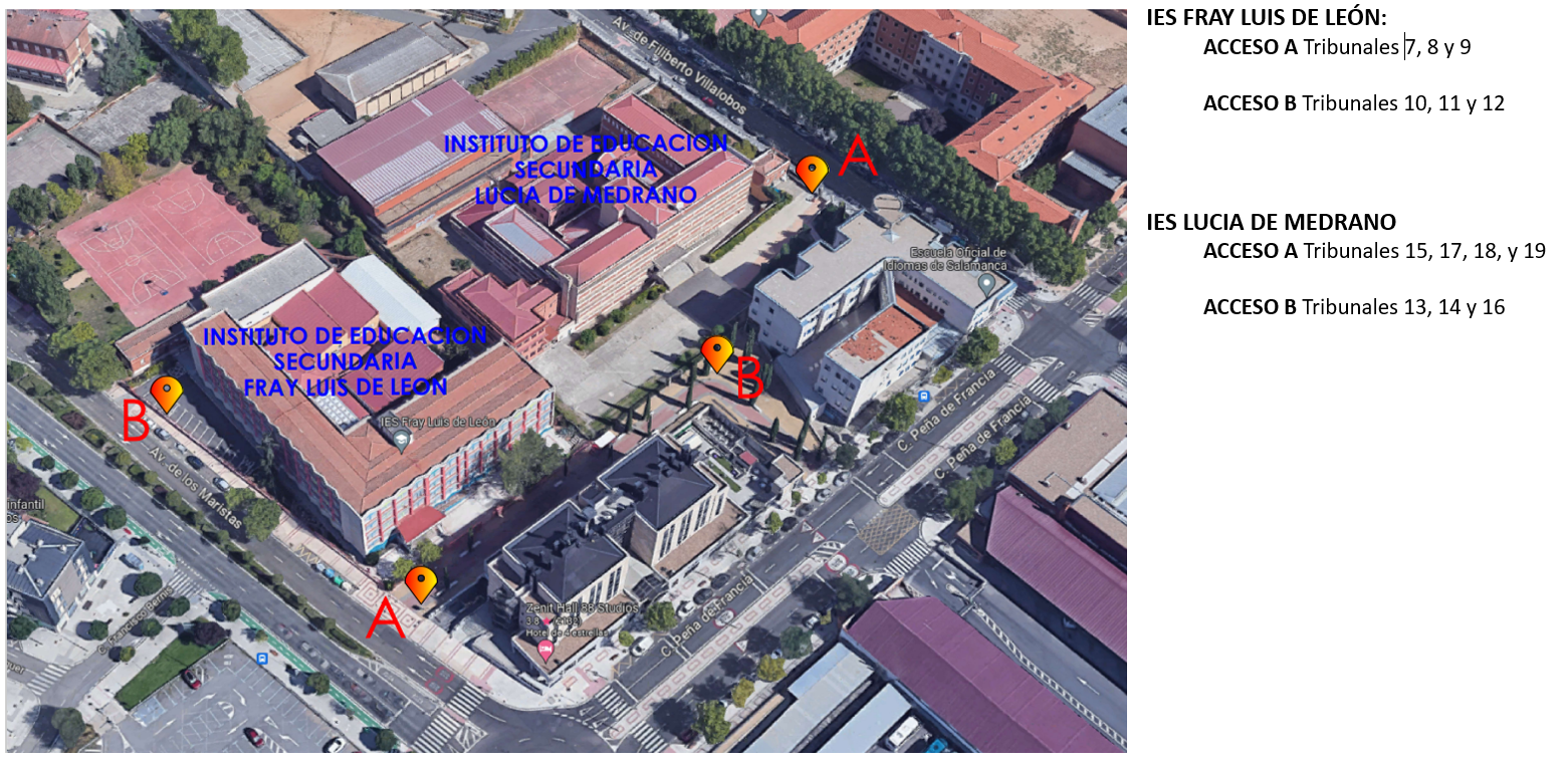 En el apartado específico de cada tribunal se puede ver un mapa con la ubicación de la sede correspondiente. Las sedes IES Fray Luis de León e IES Lucía de Medrano tienen dos accesos cada una. En el plano adjunto se indican estos accesos y los tribunales que deben utilizar cada uno de ellos. EL IES Fernando de Rojas dispone de un único acceso que coincide con la entrada principal del mismo.