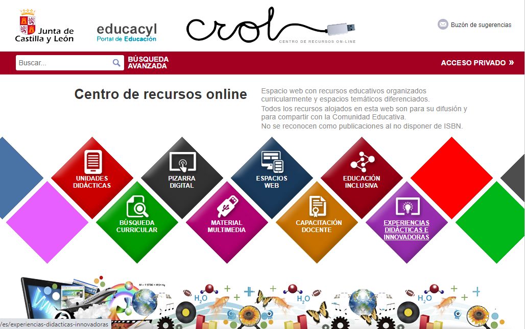 Nuestro Centro de Recursos OnLine(CROL) es un ambicioso proyecto de la Junta que se inició hace ya unos años desde el CRFPTIC de Palencia. La idea era crear un repositorio de recursos para docentes que estuvieran perfectamente indexados en función del currículo y en el que pudieran colaborar con sus aportaciones los docentes de nuestra comunidad. Espacio web con recursos educativos organizados curricularmente y espacios temáticos diferenciados. Permite una búsqueda selectiva, incluso tiene un listado de las actividades mejor valoradas.