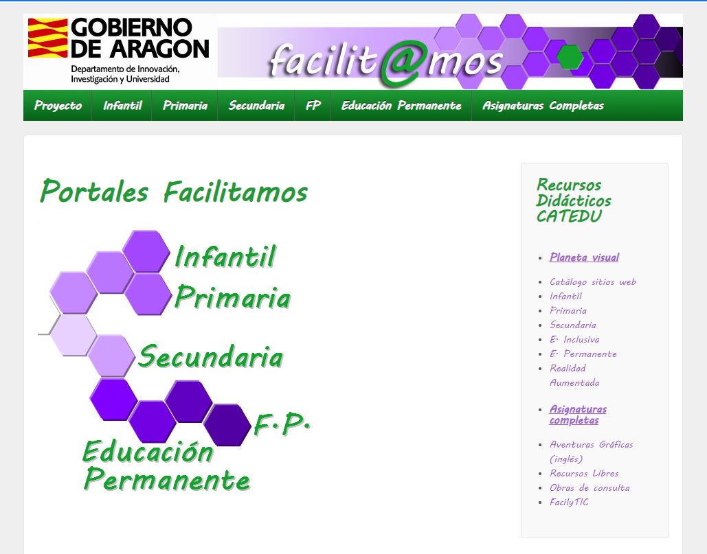 ♦ Facilitamos (Aragón). Repositorio de contenidos y actividades para todos los niveles. Destacamos las Unidades Didácticas, si bien, hay muchas más para Secundaria. Hay áreas incompletas. Y ciertos recursos hechos con Flash que ahora no funcionan.