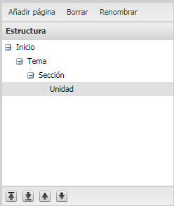 La estructura o árbol de contenidos puede tener hasta tres niveles de profundidad, temas, secciones y unidades; cuya denominación es personalizable desde la pestaña Propiedades del "Área de trabajo".