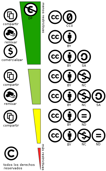 Espectro de licencias Creative Commons entre dominio público (arriba) y todos los derechos reservados (abajo). El lado izquierdo indica los casos de uso permitidos, el lado derecho los elementos de la licencia. El área de verde oscuro indica las obras que tienen licencias compatibles con el sello de Free Cultural Works, las dos áreas verdes claro con la de cultura Remix.