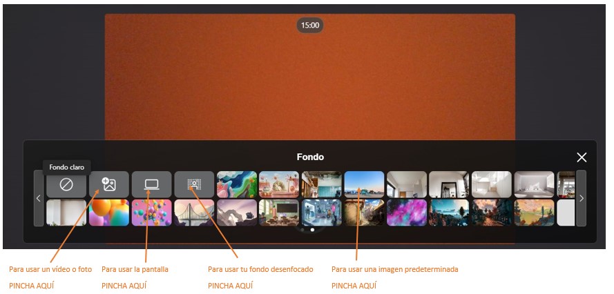 - Puedes elegir entre tu propio fondo, un vídeo o foto de tu equipo, tu pantalla, desenfocar tu fondo o una foto predeterminada.