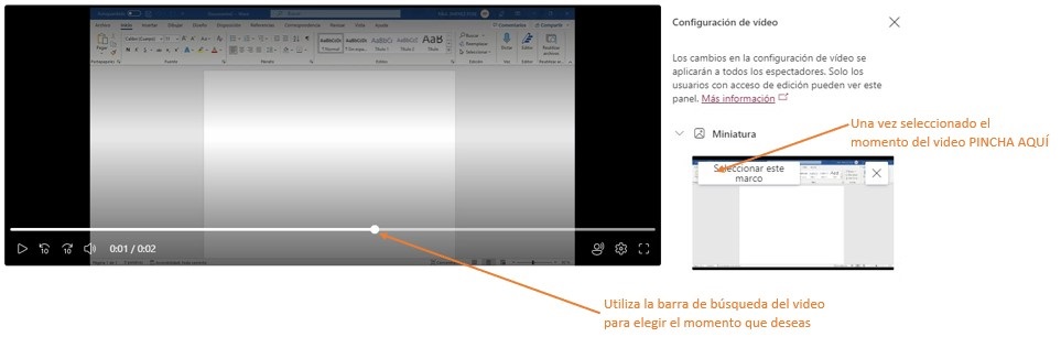 - O elegir un momento del video pinchando en el Lápiz de Editar miniatura y con la barra de búsqueda del video elegir el momento que deseas, por último pincha en Seleccionar este marco.