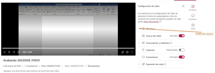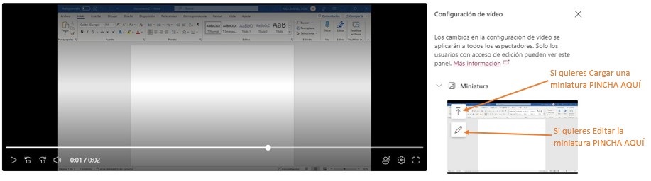 - En el caso de que decidas cambiar la Miniatura que da imagen a tu video pincha en Miniatura para Configurarla o Cargar una diferente.