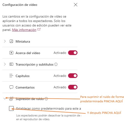 - Por último tienes la opción de Suprimir el ruido activando esta opción para que el video se presente de esta forma así predeterminado, sin embargo los espectadores podrán desactivar la supresión de ruido en el reproductor de vídeo.