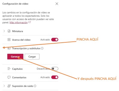 - También tienes la opción de poner Subtítulos. Pincha en Transcripción y subtítulos y después elige Cargar si tienes el archivo con los subtítulos o el propio programa los Genera por ti si pinchas en Generar.
