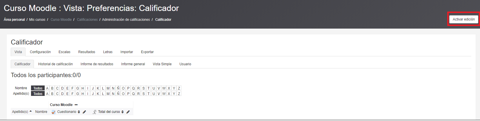 Se podrá personalizar lo que se muestra en el libro de calificaciones pulsando en el botón “Activar edición” que aparece en la