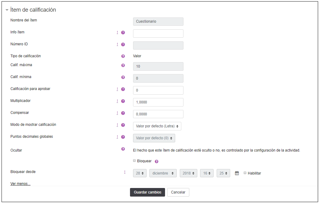 mínima, la calificación necesaria para aprobar, los puntos decimales, y además se podrá bloquear activando la casilla y