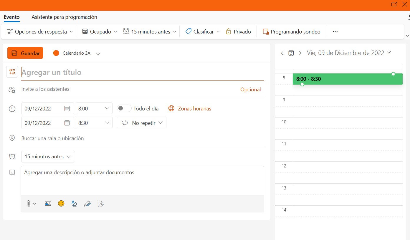 Una vez creado el calendario, podrás incluir nuevos eventos haciendo doble clic en el día del mes que necesites. En la ventana emergente que surge, podrás seleccionar el calendario en el que quieras añadir el evento y las opciones de tiempo y localización. También es posible añadir una pequeña descripción e invitar a los asistentes en el caso de tratarse de una reunión de Teams (aplicación con la que está vinculada).