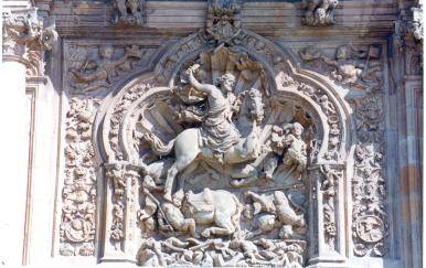 Ante la fachada occidental de la catedral el peregrino se encuentra, por primera vez en su recorrido por la ciudad, frente a frente ante la representación del personaje cuya vida y, sobre todo y sorprendentemente, su leyenda, le convirtieron en el motor, en el medio o en el instrumento de uno de los fenómenos religiosos, culturales, socieconómicos y urbanísticos que han marcado y construido en gran parte a Europa: Santiago el Mayor y el Camino de Santiago, o mejor, los Caminos a Compostela. Santiago fue hijo del pescador galileo Zebedeo, hermano mayor de San Juan el Evangelista, y, junto con Pedro y Andrés, uno de los primeros apóstoles de Jesús, de donde le sobrevino el epíteto de el Mayor. De acuerdo con la tradición oriental, se supuso que había predicado la fe en Siria y en Judea, y que cuando regresó a Jerusalén, en el año 44, había sido decapitado por orden de Herodes Agripa. En cambio, la tradición española, que contradice la leyenda palestina, sostiene que el apóstol Santiago habría viajado a España para difundir el Evangelio, en Zaragoza se le habría aparecido la Virgen en lo alto de una columna de jaspe (la Virgen del Pilar) y, después de su martirio, sus seguidores habrían trasladado su cuerpo hasta Galicia en una barca guiada por un ángel (Réau, 1998, t. 2, v.5, 169-170). Casi seiscientos años de silencio documental sobre la supuesta presencia de Santiago en España y la absoluta ausencia de culto demuestran que no hubo tal viaje (Sotomayor, 1979, 150-156). La primera mención, recogida en el Breviarium apostolorum, escrito, al parecer, hacia el año 600 fue instrumentalizada por el monje Beato de Liébana para apoyar sus tesis frente al arzobispo toledano Elipando en el conflicto religioso del adopcionismo durante el siglo VIII, que en el fondo encubría una lucha por la preeminencia de la nueva y joven iglesia asturiana frente a la tradicional iglesia mozárabe de Toledo. El fenómeno de la aparición de los supuestos restos del apóstol y de algunos de sus seguidores en el campus stellae (Campo de la Estrella) y el crédito inmediato que le concedieron la iglesia y la monarquía asturiana debe encuadrarse en el proceso político de búsqueda de legitimidad que caracteriza a los nuevos reinos cristianos altomedievales (Estepa, 1985, 91 y Martín, 1995, 9). Idéntico marco histórico tiene la mítica batalla de Clavijo, con la que finalizó, según los cronistas, el Tributo de las Cien Doncellas, y comenzó el apoyo divino a los reyes de Asturias ejercido por medio de la espada del Santiago caballero o Matamoros
