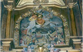 El templo conserva tres esculturas ligadas estrechamente a la peregrinación a Santiago: dos están en el retablo mayor, una imagen de bulto redondo de San Lázaro y un relieve de Santiago Caballero en su coronación, y otra, un San Roque, que se custodia en la sacristía aunque está prevista su instalación en las naves del templo. San Lázaro, cuya imagen, como sugiere Fernando Llamazares, es probable que procediese de la iglesia del hospital desaparecido, es el patrón de los leprosos y también de los mendigos, sepultureros y panaderos (Réau, 1997, 231-233); viste atuendo de peregrino, con bordón sencillo en la mano izquierda y zurrón en el costado derecho sostenido por una cuerda cruzada sobre el pecho, y nos muestra una llaga en su pierna derecha adelantada. Santiago Caballero o Santiago Matamoros blande su espada en la mano derecha, con la capa al viento, aplastando bajo los cascos de su caballo a nueve infieles y a otros dos equinos, todos dispuestos en escorzos violentos y contrapuestos, mostrándonos su iconografía habitual desde que Santiago contribuyera milagrosamente al éxito de las huestes cristianas del rey Ramiro I en la legendaria batalla de Clavijo (Sureda, 1999, 99-104). La escultura de San Roque es de pequeñas dimensiones pero completa iconográficamente: vestido de peregrino, porta bordón con una calabacilla, está tocado con un sombrero decorado con las llaves de su peregrinación a Roma y le acompaña un perrito que le ofrece un mendrugo de pan en la boca.
