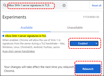 - En la caja de texto superior (una lupa) escriba: Allow SHA-1 server signatures in TLS.