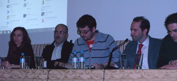 En la siguiente mesa redonda intervinieron Javier Jacobo González, profesor de Historia de la puesta en escena de la ESADCYL, Margarita del Hoyo, profesora de Dramaturgia de la ESADCYL, Pedro Ojeda, profesor de Literatura de la Universidad de Burgos, y Rodrigo Zaparaín, arquitecto, pintor y escenógrafo (imagen derecha). Departieron sobre cine y literatura dramática.