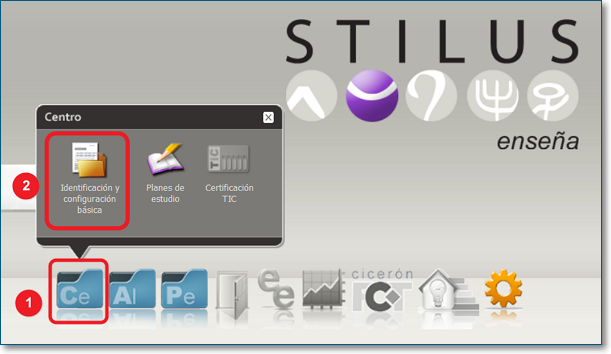 La selección de usuarios se realiza en la aplicación de "Stilus enseña", accediendo a la carpeta de "Centro" (1) y seleccionando "Identificación y configuración básica" (2):